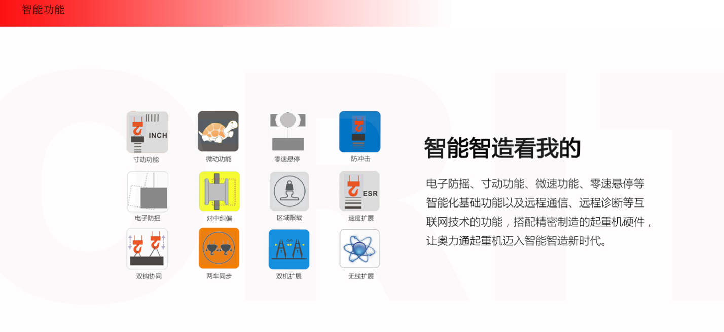 Электронная защита от сотрясений, функция толчкового режима, функция микроскорости, зависание на нулевой скорости и другие интеллектуальные базовые функции, а также функции интернет-технологий, такие как дистанционная связь и дистанционная диагностика, вместе с высокоточным оборудованием для кранов, позволяют кранам ORITCRANES вступить в новую эру интеллектуального и интеллектуального производства.